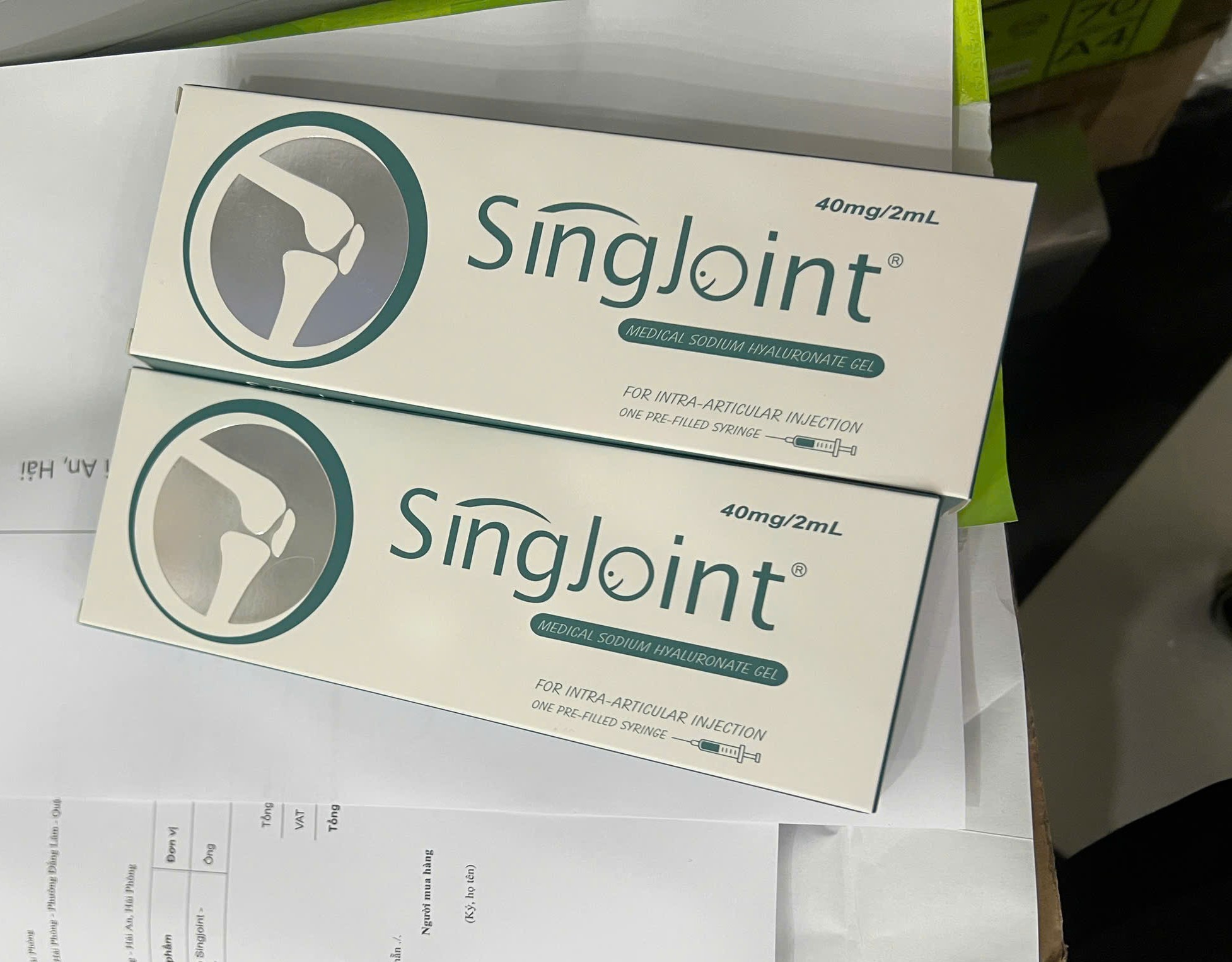 Dịch nhờn khớp gối Singjoint 40mg/2ml được nhập khẩu. Và phân phối bởi Công Ty AZ Việt Nam. Sản phẩm đầy đủ giấy tờ, xuất hóa đơn đỏ VAT. Công ty có trương trình khuyến mại, mua 10 tặng 1.